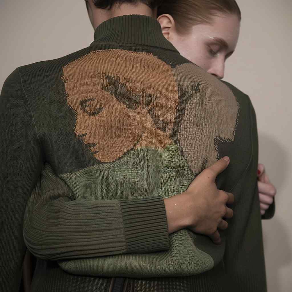 Central to our concept is the eternal nature of the point, celebrated through the infinite fragments reminiscent of the enigmatic number pi. This fusion of art and fashion is exemplified through visuals transformed into jacquard sweaters, each thread meticulously interwoven to create a tactile and visual composition that resonates with thought-provoking elegance. We took cues from Tokyo's busy metro scene and used scanning and 3D printing to capture the sensation of being surrounded by a sea of faces. The flattened faces in our designs represent the complexities of crowded cities and the diversity of people within them.