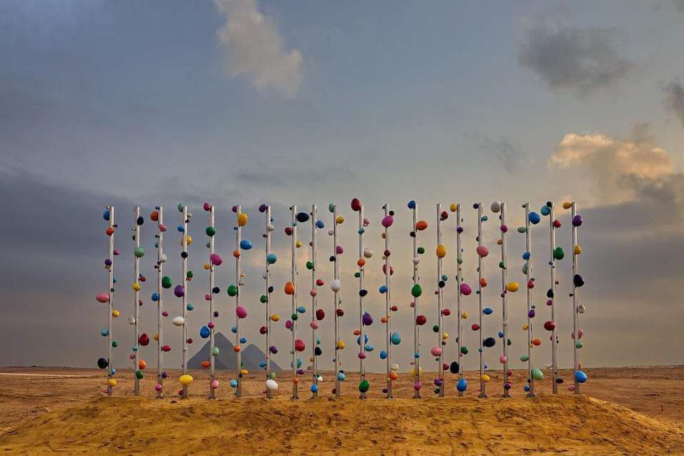‘Dreams in Giza’ is a monumental artwork especially created for the second edition of Art d’Egypte and sponsored by Galleria Continua. It’s a perfect union of the colorful and exuberant art of Pascale Marthine Tayou and the majestic and timeless history and culture of Egypt. Twenty stainless steel tubes rise from the hot sand. Like flutes, ancient witnesses of the banquets and celebrations of the pharaohs, these new totems whistle and play with the wind. They are adorned with colored wooden eggs, symbols of good omen, of rebirth: a key element in the works of Pascale Marthine Tayou but also a reference to ancient Egyptian mythology, where the Cosmic Egg held a central place as a primordial symbol of birth and creation, generating the sun god Ra.