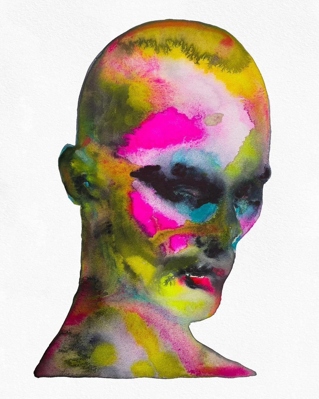 The heads began to appear subconsciously and I found I was still able to imbue a certain amount of abstraction into the textures and colors using the wet-on-wet watercolor technique. On the verge of abstraction is a good way of putting it. The whole process of working wet on wet with watercolor is quite risky and a lot is left to chance. I am interested in how the materials and process affect the outcome. I don’t want to see too much of my hand in the work. The most successful works for me are ones that feel like pools of color have converged by chance to form an eye or mouth or the entire head.