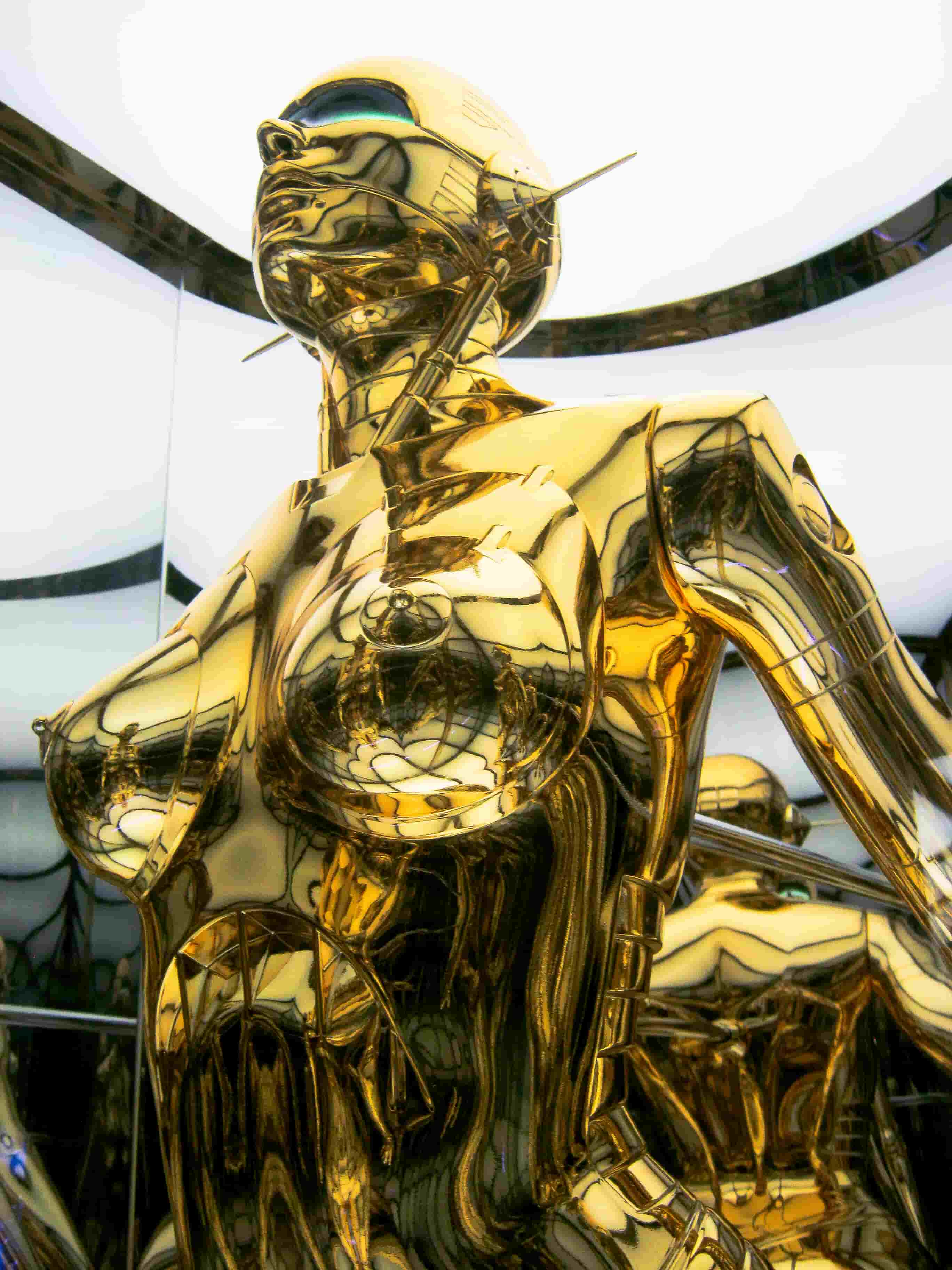 His figures are sensual, almost provocative. The curves of their metallic bodies recall classical sculpture, yet they belong entirely to an artificial universe. These are designed bodies, polished to perfection.