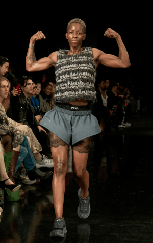 We created these strong muscle-shaped garments to convey the message throughout the collection. Almost everything had a strong arm whether it was the model or the sleeve. We also made a bag (AB BAG) creating the illusion of abdominal muscles.