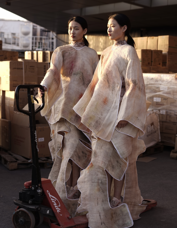 This cyclical relationship between waste and renewal also lies at the core of Yilin’s fashion collection dubbed Fluidirty. Yilin’s work in Fluidirty challenges the norms of fashion by connecting identity with ecological consciousness. She explores the concept of fluidity, not just in terms of identity, but also in the materials she uses—ancient textiles like Ramie and traditional Gambiered Guangdong dyeing techniques transformed into modern creations. The garments act as vessels for human identity, blurring the line between clothing and packaging, with a focus on zero-waste cutting patterns and sustainable design. Through Fluidirty, Yilin emphasizes the need to reconsider the life cycle of garments, encouraging a shift from fast consumption to thoughtful production that honors both heritage and the environment.