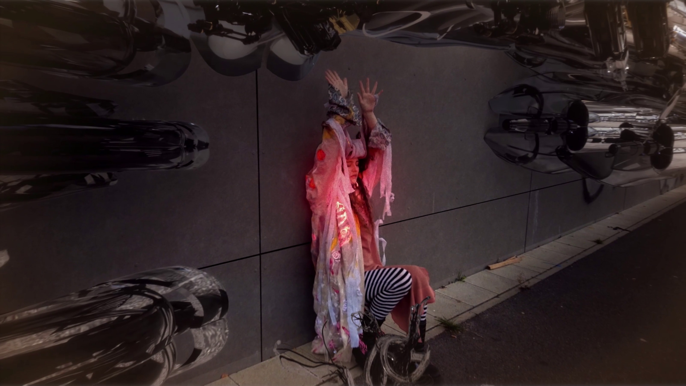 The only negotiating stuff I remember was technical discussions. “00045 forgive” was actually the idea of AUJIK, and he asked me if I am open to filming it. I was so excited and wanted to give it the honor it deserves. Therefore I painted a coat and outfit for it in my own painting style and asked Rocio Gauna to film me and help with the light. After that we got into the long process of editing. AUJIK added his magic with his cybernetic trees moving along and dancing with me and I tried to bring the material together in the cutting and final editing of the video.