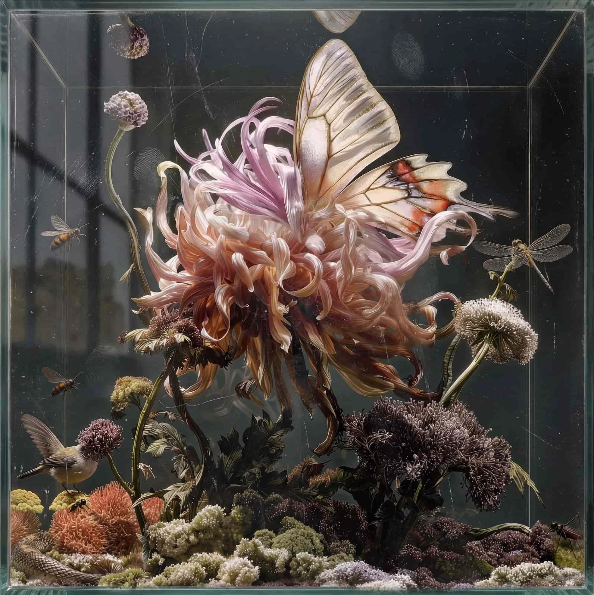The desire to contain these worlds comes from the fact that they naturally tend to expand. In images like this, forms seem to grow, intertwine, and invade the space. The central flower is no longer just a flower, but a complex organism, almost animal-like, crossed by wings, veins, and movement. The vitrine becomes a device of containment, but also of observation. The glass is a threshold. It separates, but makes everything visible and exposed. At the same time it is a fragile boundary. The fingerprints, scratches, and traces on the surface suggest that this limit has already been questioned. I am interested in the idea that sooner or later that glass will be crossed, and that these ecosystems might escape or transform the external space.