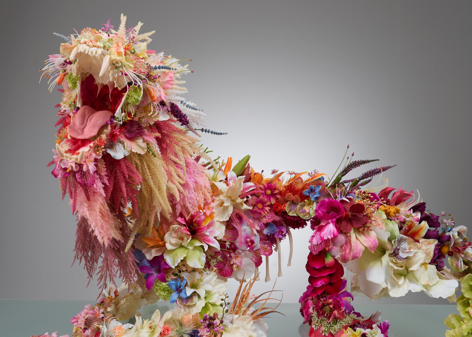 Take, for instance, Leo Vulgaris—a lion skeleton adorned with artificial flowers. The idea stemmed from a desire to create something both soft and aggressive. The skeletal structure of a lion naturally embodies power and dominance, while the vibrant flowers introduce a sense of renewal and fragility.