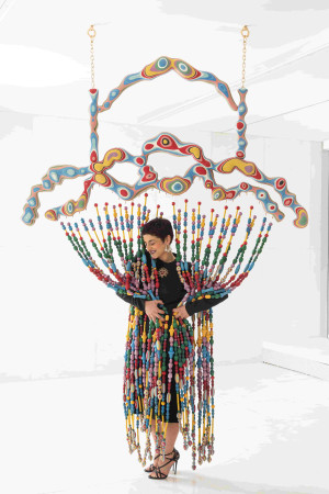 I was working with layers of colorful wood carved to create this crazy shape for my curtain.