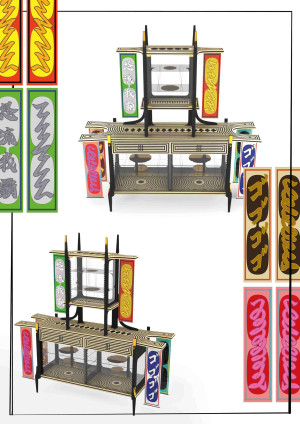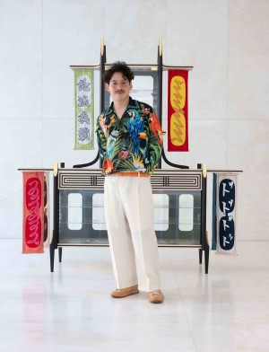 The idea of Shima Uma is that I wanted to create a piece which celebrates and reflects this entire project. DG has invited 10 designers from all over the world, from different cultural backgrounds, to come to Italy and gave us a chance to push our limit of designing a new collaboration with the local highly skilled artisans. But also combining my own experiences as a multicultural background. So, my piece has the element of the European part like Vienna secession, wiener werkstätte/ Josef Hoffman/ koloman moser on the high-quality marquetry part as the shape of Charles Rennie Mackintosh or Frank Lloyd wright. Those triangle shaped Legs are inspired by one of my favorite chairs from Italian architect Gio Ponti called Superleggera. The work gives you the feeling of warrior / Victory, so I made a gold plated shape in the glass shelving and it has the typical shape of the parts of the samurai sword which are the most Important parts to protect the hand from the attack from the others. Using textiles in this piece was essential as DG is originally uses Textiles for their luxurious garments. Fashion with slightly provocative brand image reminded me of my experience back in the day. There is a special fashion culture for the youth rebels when they graduate their school they often amend/tailor make their school uniform and embroider their name and dates and years, teams name and some memories etc. on the garments and they often use some aggressive character to provoke teachers and their enemies. On the one Flag it says DO RU GA BA which is a short form of calling Dolce&Gabbana only in Japan, but I borrowed the different character which shares the pronunciation but has the aggressive meaning. In the other flags there is some Japanese writing of sound as DODODODO or GOGOGOGO. It's often used in the background sounds of scenes in the comics. As POW!! POW!! or BOOOM!!! in this way I wanted to make it more comical and creates the balance of other provocation with the other writing. And there are some other strokes and those are there to just trick the people, but it has no meaning.