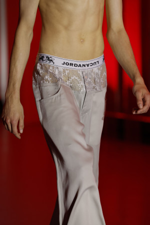 Draping takes center stage in JORDANLUCA SS24, emphasizing high-necked austerity, lace, ruching, and gathering. Both menswear and womenswear feature suiting that carries connotations of The City and Wall Street. These designs are not mere reflections of the past or projections into the future; they are creations for the present moment. With an extreme and binary understanding of men's and women's bodies, JORDANLUCA challenges gender norms while still honoring traditional silhouettes.