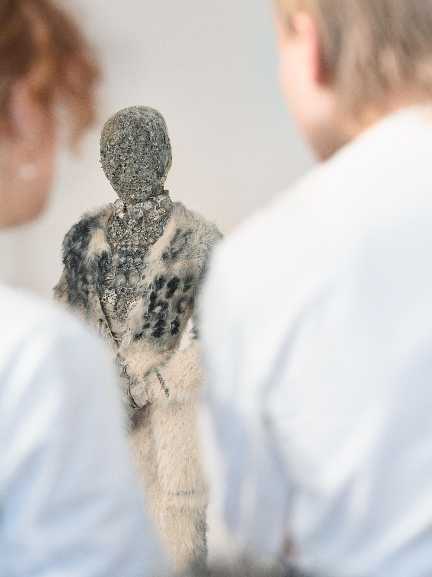 Margiela’s signature codes, from bianchetto painting to second-skin silhouettes and the anonymity of masks, are sharpened this season. Tailoring is dismantled and fused. Tailcoats are cut short, trenches bonded with jersey, leather merged into tweed. Elsewhere, distressed vintage dresses are stripped back to their ghost, leaving only their imprint on new forms. Edwardian references thread through the collection, visible in high necklines, elongated silhouettes, and sculptural sleeves. A six-metre painting becomes a dress without being cut, while beeswax seals garments into preserved relics, reinforcing the idea of clothing as memory. Accessories extend this language of transformation. Heel-less footwear, cut-out boots, and evolving icons like the 5AC and new Link bag continue the dialogue between function and illusion. With its first show in China, Maison Margiela positions FW26 as both a cultural exchange and a manifesto. This is fashion as archaeology, where the past is not referenced but physically embedded into the future.