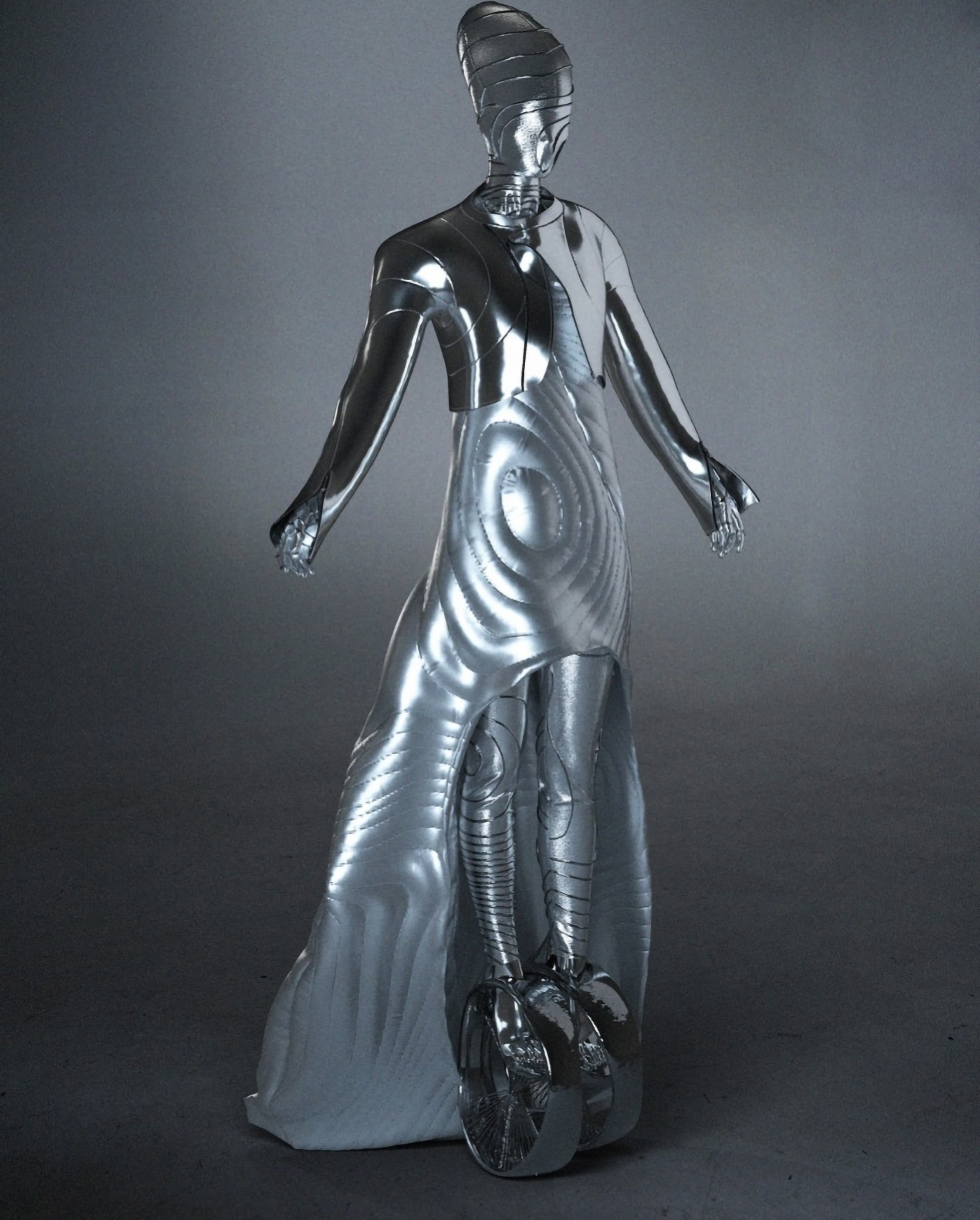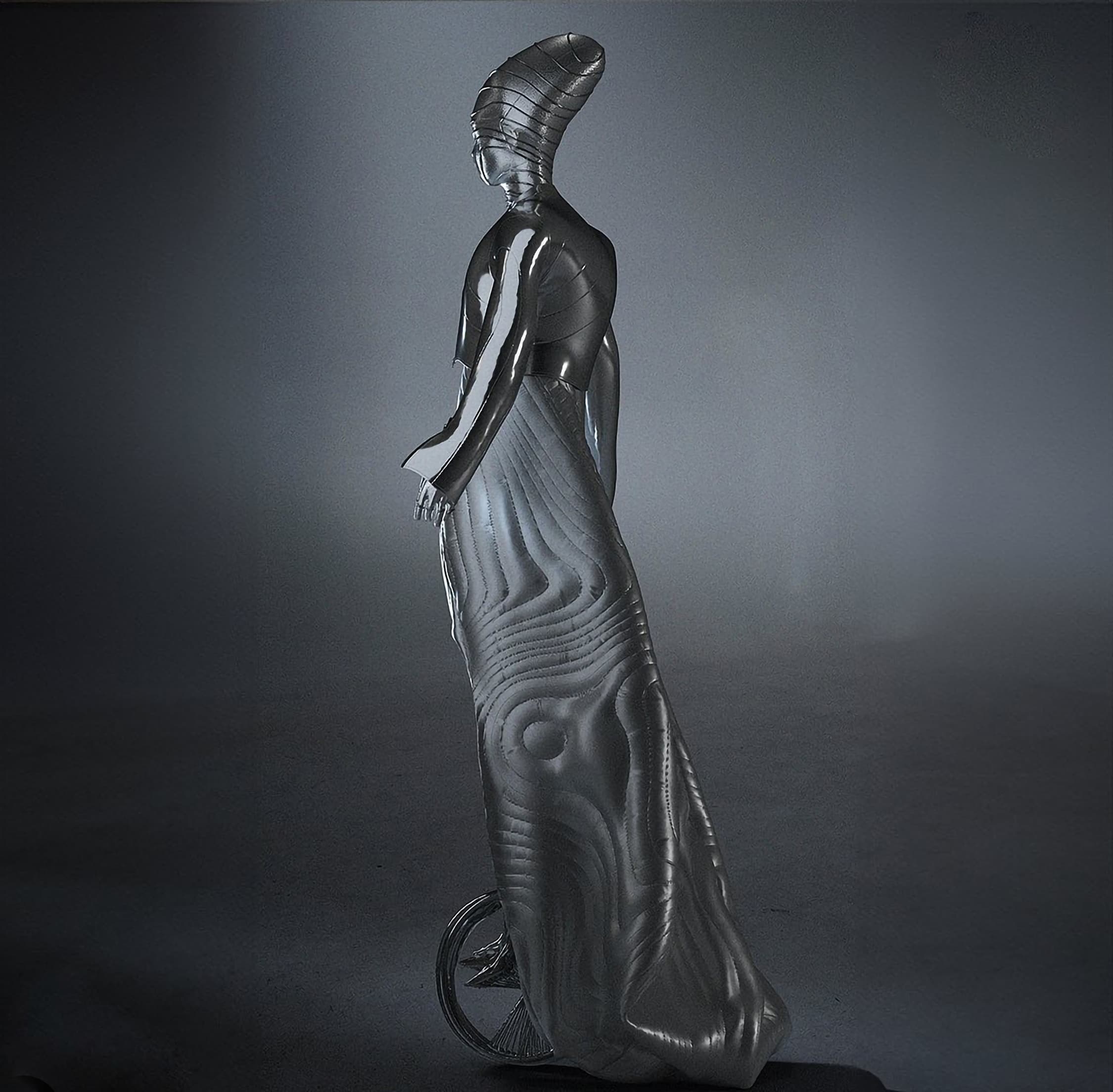 In the context of digital creations and as our first collection, “Ancestors” Fall 2022, aimed to be shown under the bracket of “ Paris Couture” we felt for introducing, along with traditional luxury textiles, precious materials not usually used for garment making such as marble, crystal, chrome and copper metal, which allowed for an unexpected yet familiar couture.