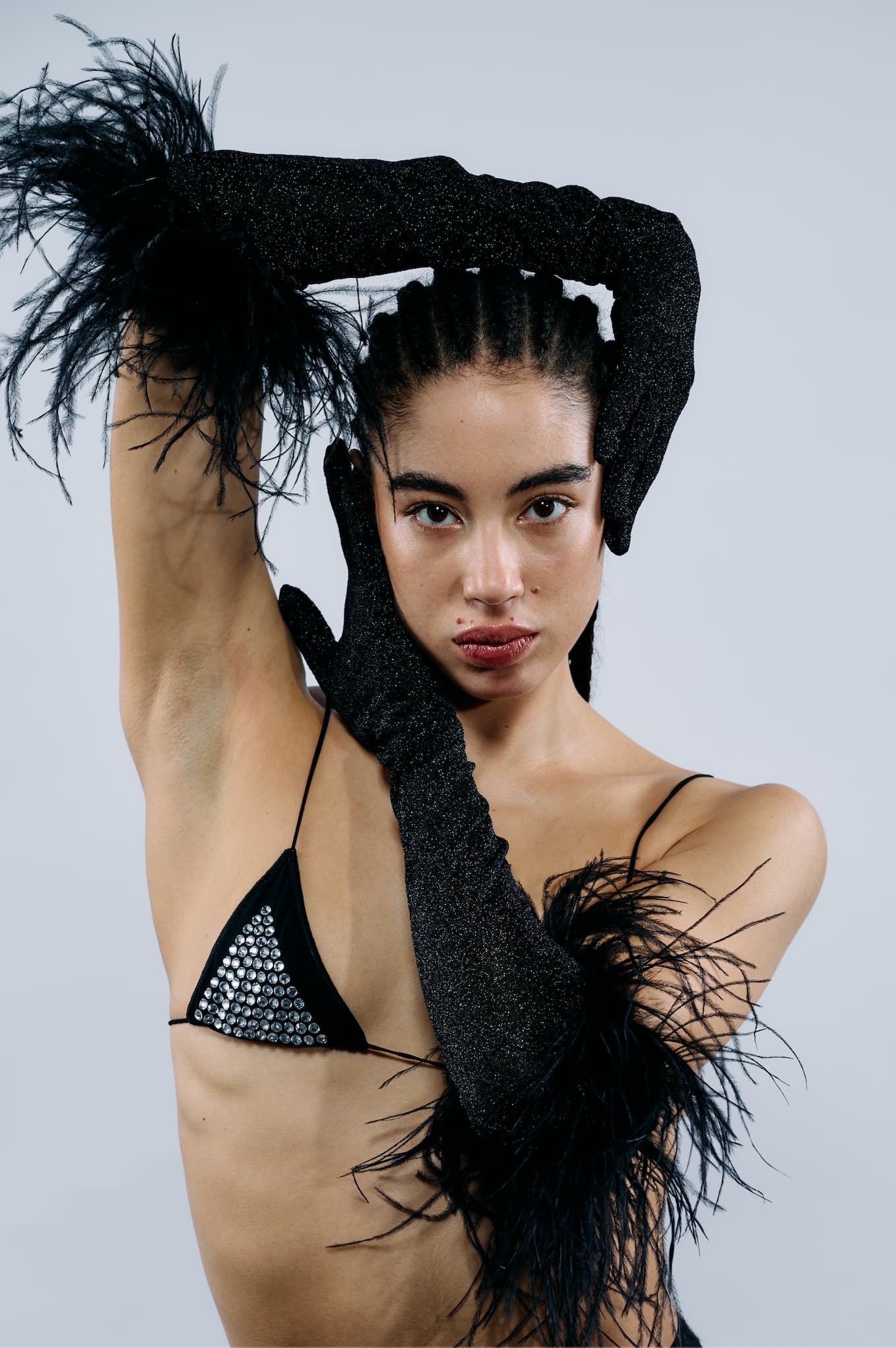 Oséree brings you the perfect combination of allure and elegance with the Lumière Plumage Gloves. Sexy, chic, and undeniably stylish, these gloves embody the spirit of French glamour while proudly celebrating Italian craftsmanship. Made entirely in Italy, Oséree elevates your night out with these stunning, glittering gloves adorned with dramatic black feathers. They look like an essential part of your festive outfit, guaranteed to turn heads.
