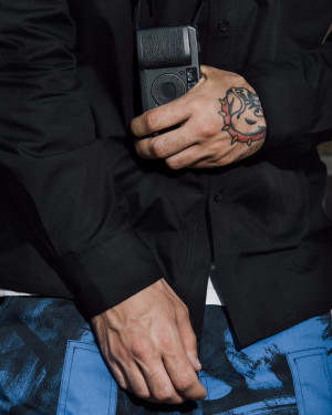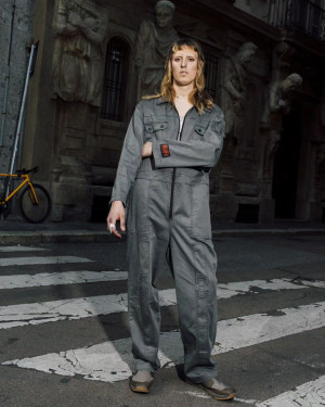 The main print used in the collection features a classic "buffed" (erased) Dumbo tag that transforms into a pattern, symbolizing resilience. A historic photo by Lele Saveri, taken on the M2 subway cars, is decontextualized and used as a manifesto photo on a formal dress made of cool wool, digitally printed. Furthermore, lines and marks synonymous with actions seemingly liberally conquer the fabrics used. Take, for example, the trench coat in Japanese twill fabric, altered with black color through a performative movement. Following that, there's a distinctive garment-dyed jumpsuit with multifunctional fit and details, complemented by Japanese twill fabric sleeveless vests, pants, and shorts, all characterized - just like the jumpsuit - by applications simulating human joints on knees and the spine, complete with an integrated balaclava in the front pocket jersey. The shirt, available in black or white versions, uniquely presents itself with a hood and drawstring, stained with a radical spray stroke on the back, screen-printed on finished cotton fabric.