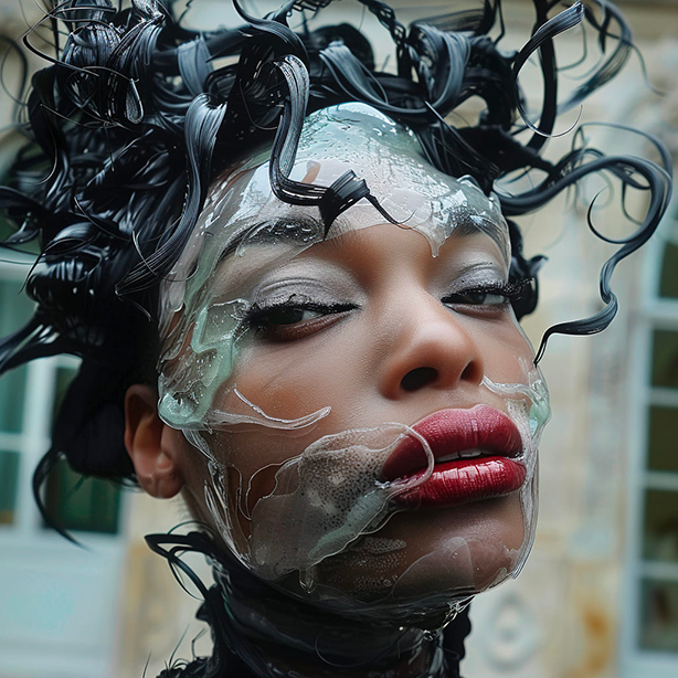 Julia Daka is our model, who spent a day with our team during Paris Fashion Week. Julia is dynamic and always active on calls. Hailing from the vibrant French islands of Mayotte and Réunion, she brings with her a fervent passion for both fashion and architecture. As a versatile and transformative Gemini, Julia has traversed from the world of fashion into architecture, finding profound connections between creativity, form, and expression in both fields. Her recent exhibition "Mémoires des formes" marked a pivotal moment in her artistic journey, providing a platform for collective expression and introspection. Aware of her dreams, she is creating a space for the next generation of artists. Through Rex's artistic vision and the magic of AI, we've crafted portraits that capture Julia's essence, showcasing her energy and versatility.