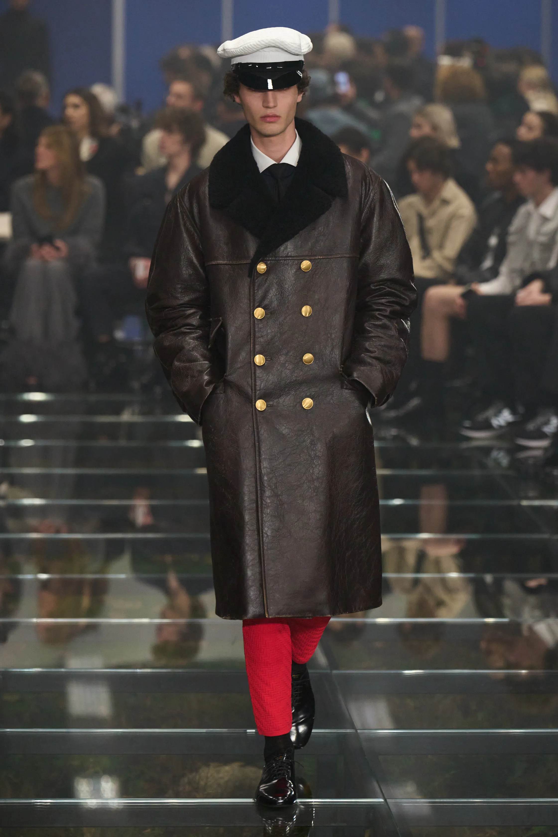 Outerwear is where Prada, and particularly co-creative director Raf Simons, truly shines. The collection boasts an array of topcoats and heavyweight jackets, versatile enough to transition from a formal dinner to a casual day in the countryside. A standout piece is the Raf Simons leather bomber jacket, complete with a shearling collar – a nod to the collection's exploration of contrasts.