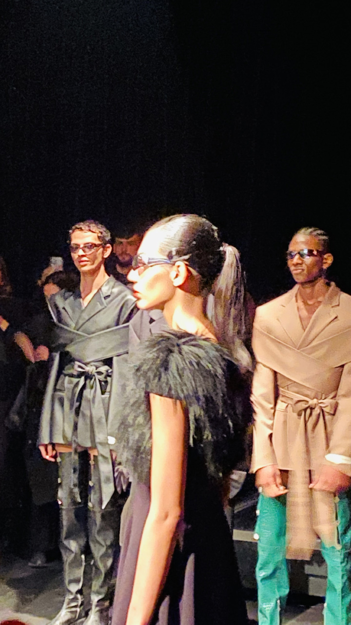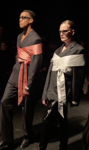 GmbH's Autumn 2023 collection breaks away from their usual themes of personal narratives and politics, instead exploring the freedom of pure aesthetics. The collection is focused on the codes and tropes of fashion, embracing the beauty of simple details like knotted bows and the buttoning of blazers. The collection features primarily shades of black with accents of pink, white, and emerald green, and a criss-cross motif inspired by the universal symbol of mining.