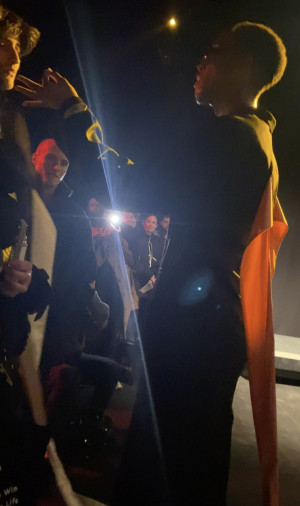 The collection is presented without a title and is referred to internally as 'untitled.' GmbH's focus on pure aesthetics creates a sense of freedom and leaves the meaning of the collection to the cut, fabrics, finishings, colors, and body. The formal exercise is presented with visceral live music by GmbH's long-time music collaborators, LABOUR, and City Ballet Corp's dancers' gesturing reminds us of a stripped-back fashion show from the past, reacting to the deafening noise that absorbs and assimilates everything and everyone.