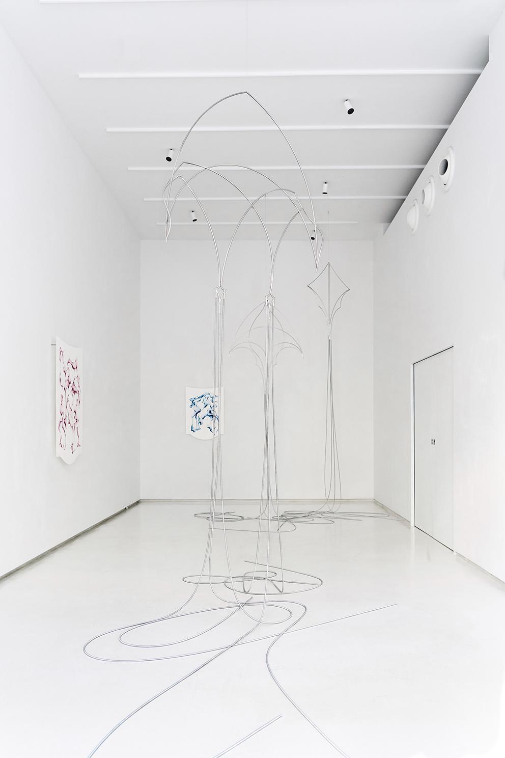 In “Speak to me in a floating way” the works on paper are full of floating shapes and figures that mix between the full and empty spaces, the steel sculptures are inspired in their shapes by pointed arches but become similar to kites or jellyfish floating in space. For the occasion I thought of the installation as an extension of the works themselves. Everything was floating, in a place that recalled a sacred but alien dimension, like entering a church but at the same time an operating room. Even in that case the will was to reach a dialogue between opposite dimensions that did not cancel each other out but fed each other.
