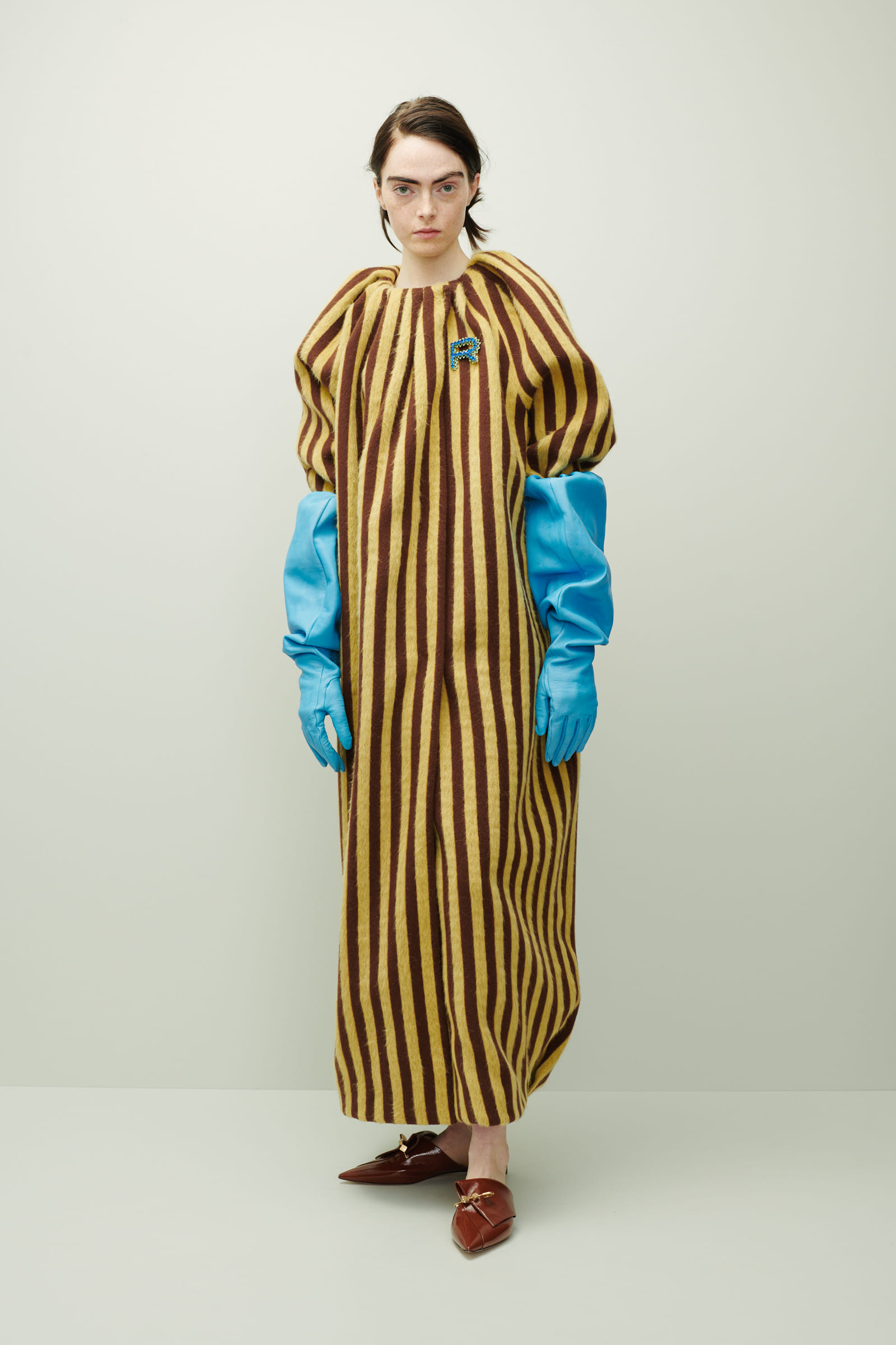 From the intimate embrace of lingerie to the comforting allure of robes, everyday attire blossoms into a symphony of relaxed volumes and sensual textures. Through pieces like the brown and yellow striped wool jacquard coat, the designer highlights the ability to anticipate and understand women's desires, as Marcel Rochas claimed, embracing their leadership and freedom of movement. As a former contemporary dance dancer, Vigilante understands that a dress comes to life only when a woman wears it, moving with grace and embodying her personality.