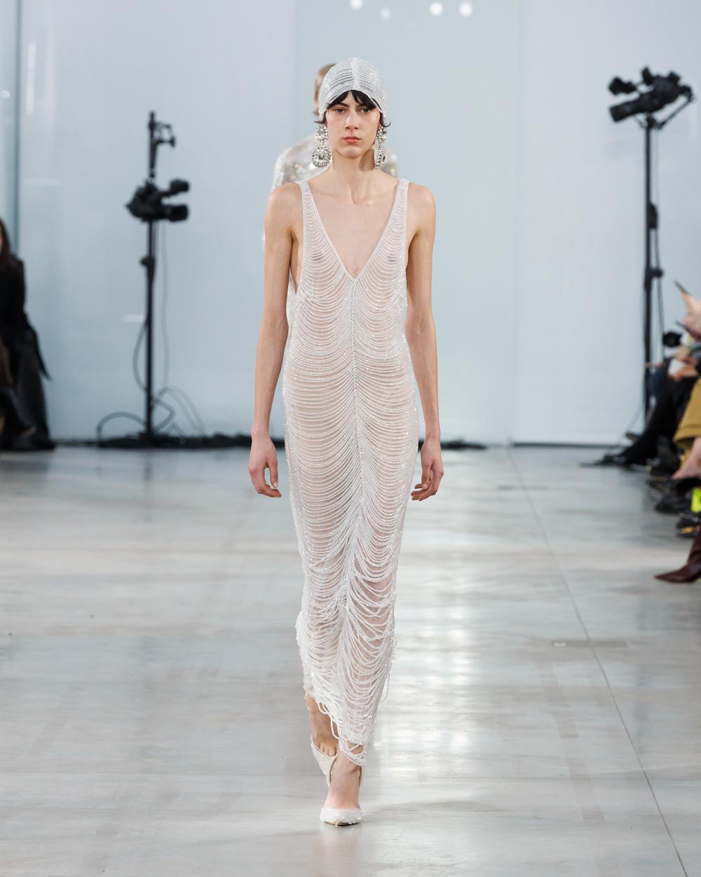 Di Morabito's recent debut on the runway transcended the conventional boundaries of fashion shows, emerging instead as a poignant reflection on the complexities of our present time. In an age marked by rapid change and uncertainty, he harnesses the power of storytelling through his designs, revealing how personal history can inform a collective vision. The fashion designer invites us to engage with our vulnerabilities while simultaneously celebrating the resilience that defines the human spirit. His Fall-Winter 2025 collection ‘’Alone with the Stars’’ is striking amalgamations of structured tailoring and fluid drapery, where elements from the past meet contemporaneous ideals. Metallic armors juxtaposed against flowing silhouettes evoke themes of protection and fragility, illustrating the push-pull dynamic we face in navigating an evolving world. The inclusion of Ameca, a humanoid robot, in his presentation served as a provocative reminder of how technology can shape our future while grounding us in the realities of our existence.