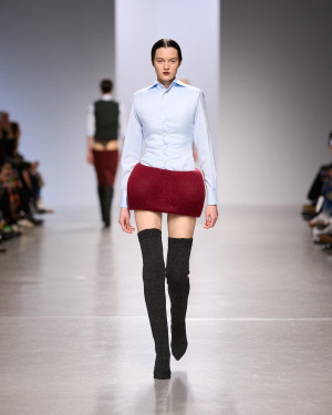 Qianhanliu studied womenswear at Central Saint Martins for her BA and has recently graduated from IFM with an MA in February. Her latest collection is about healing—a journey of understanding. It embodies a philosophy of peace, sobriety, and equality. A utopian lifestyle. A yearning for wellness. The collection draws parallels between two unreachable, overmarketed nirvanas of stereotypical Eastern oneness: the generous tailoring of one-piece cuts, easy jersey, and chunky knitwear of East Coast preppy style, and the drapery of natural textures from East Asian temple traditions. T-shirts and coats twist like knotted robes, recycled leather is printed and treated to resemble aged wood, and thousands of fallen leaves—each laser-cut from leather offcuts, singed, and stitched by hand—envelop an oversized sweater.