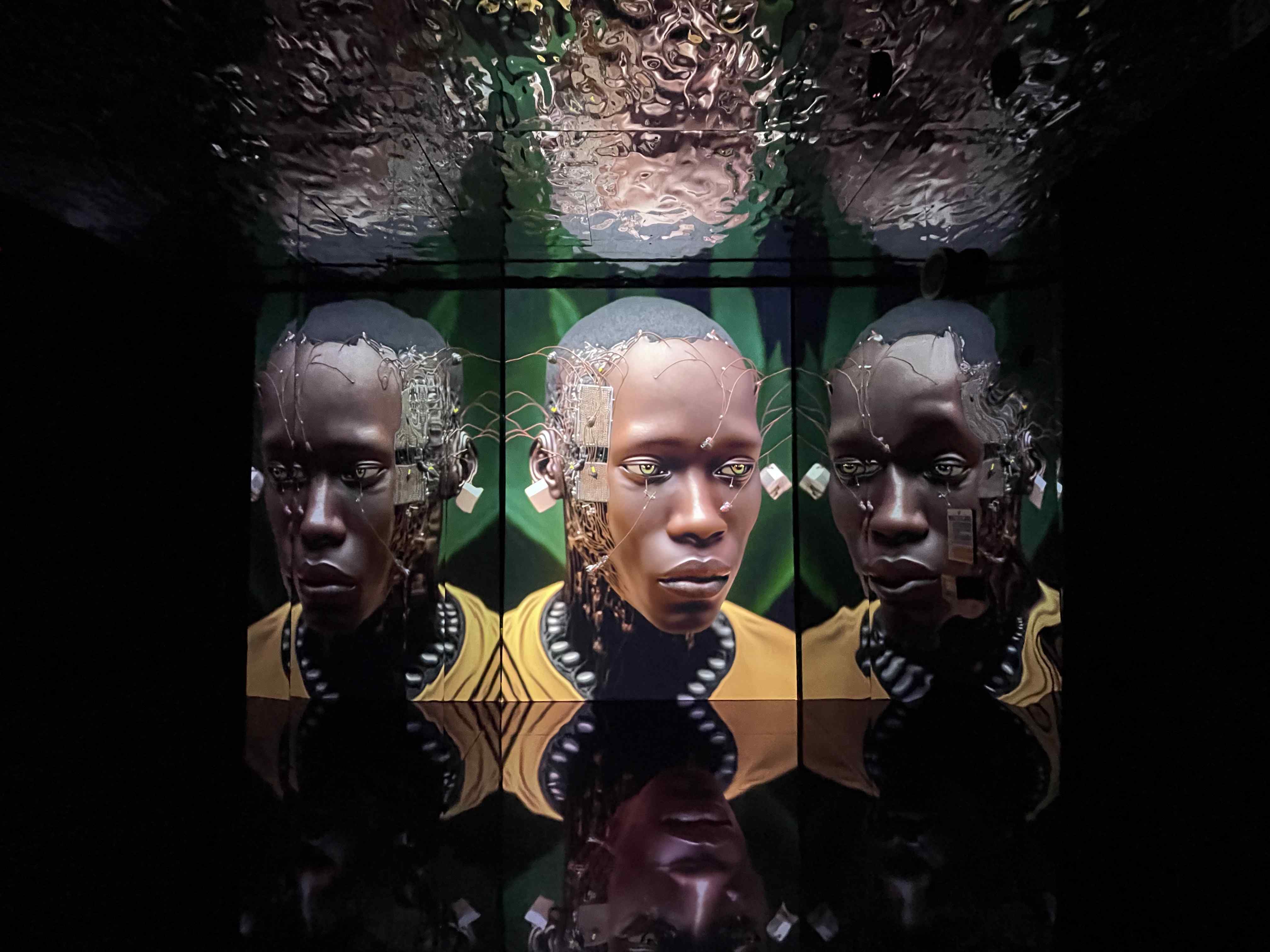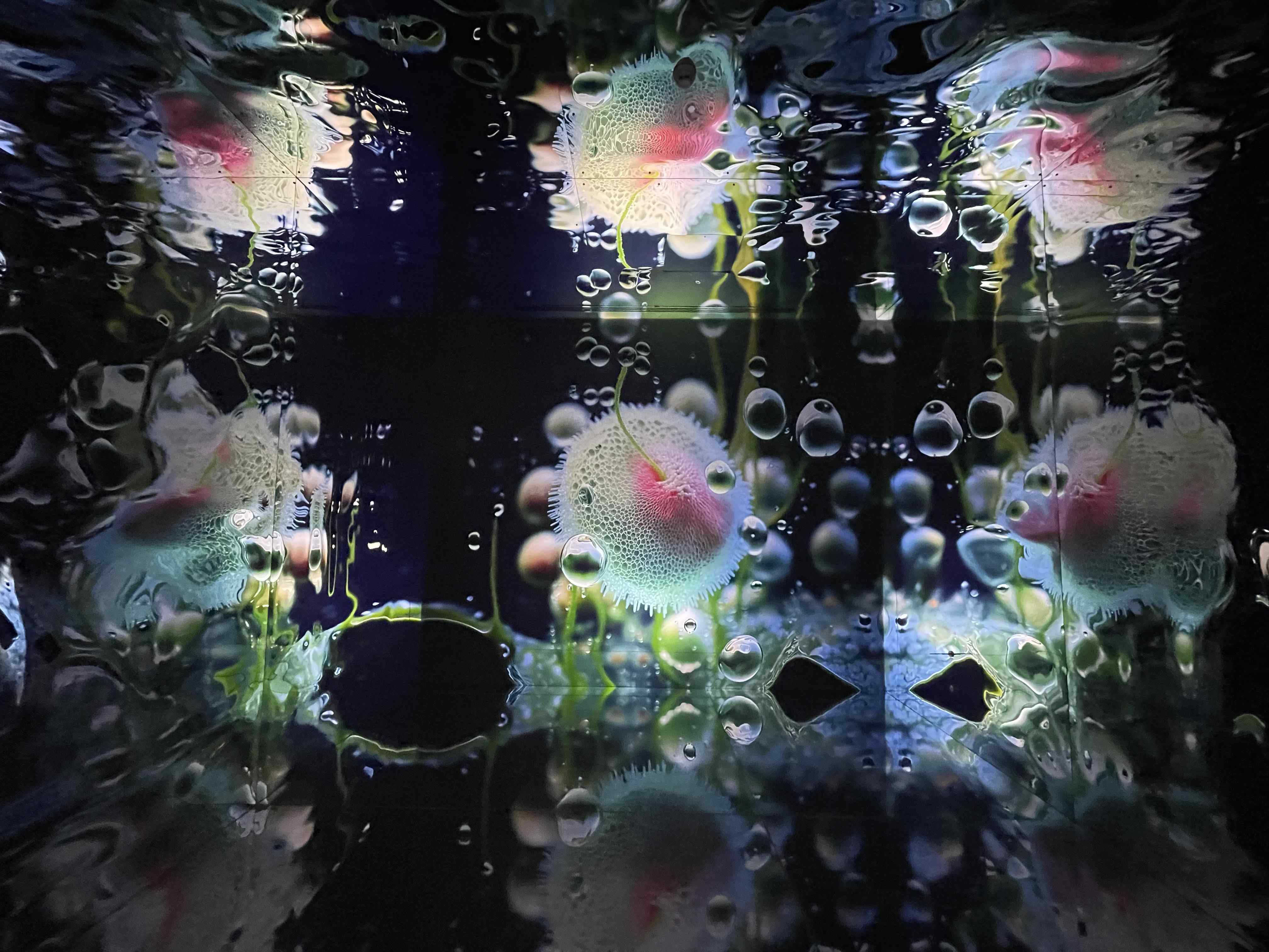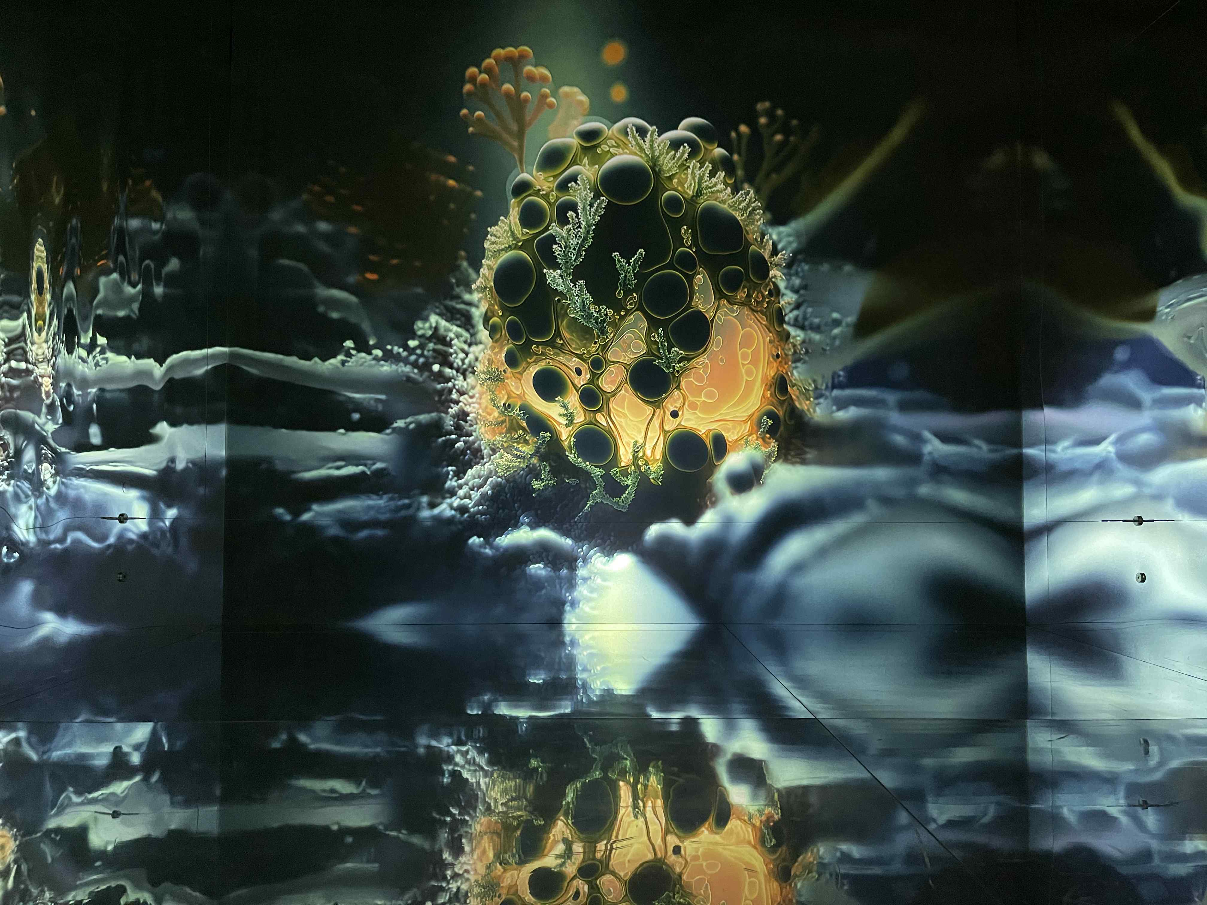 The adventure began as we crossed the threshold into 'Formation Space.' Here, Kay’s masterful artworks, born from two decades of exploration, unraveled the origins of life itself. Through mesmerizing visuals, we journeyed through the inception of organic molecules, witnessing the evolution of life from the unique vantage point of artificial intelligence. Mirrors, reflecting endlessly, drew us into a captivating tale of emergence and supervenience, blurring the lines between reality and imagination.