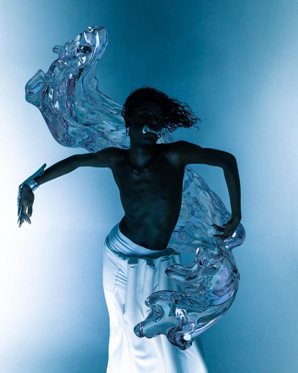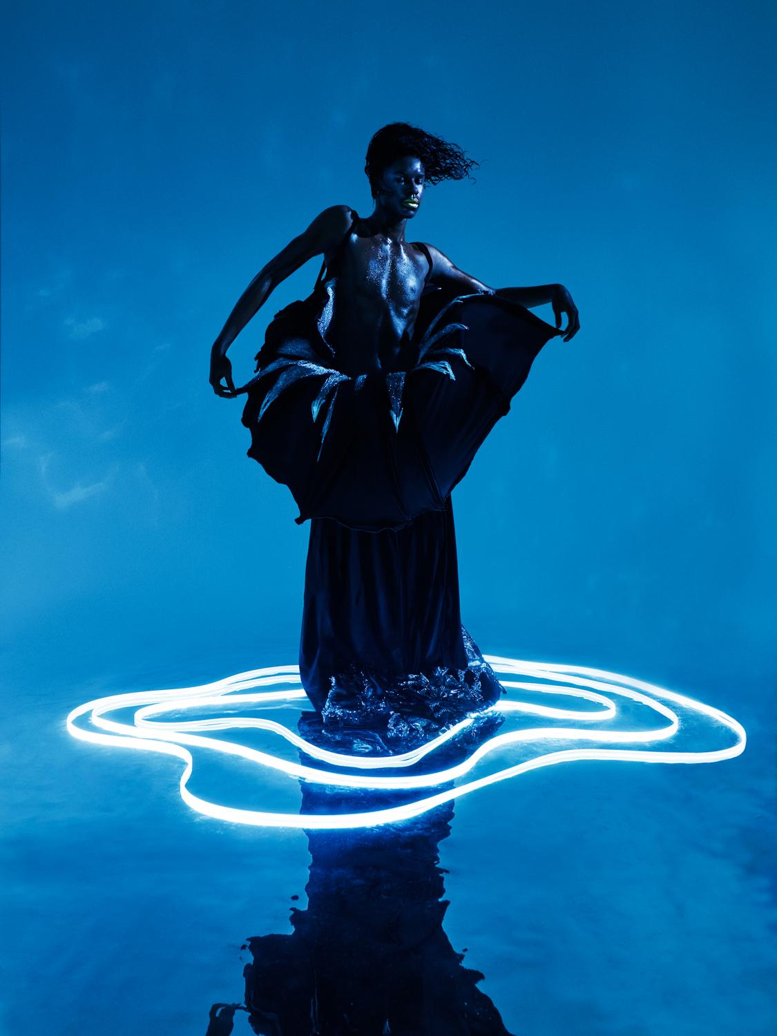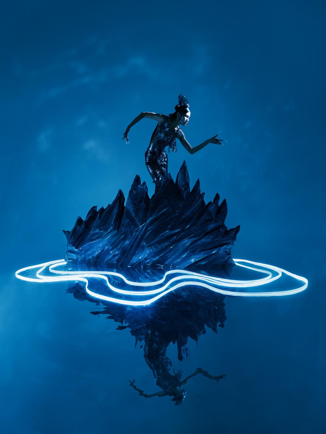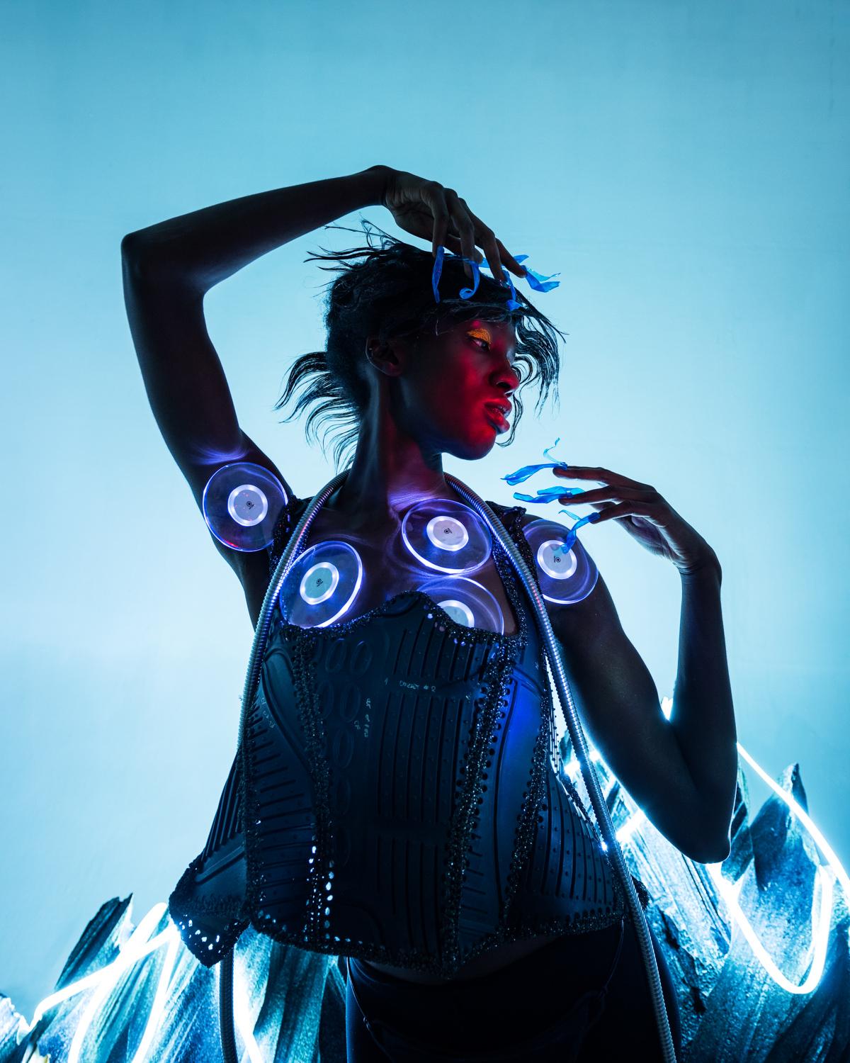 For "World 2.0," Eliška merged traditional photography techniques with digital enhancements, collaborating with 3D artists to create futuristic elements while incorporating in-camera light painting for a dynamic visual experience.