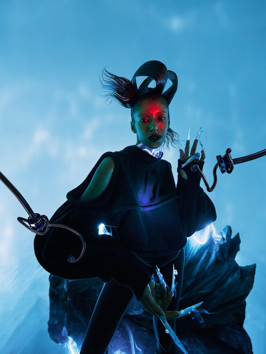For World 2.0, I merged both of these techniques. While working with the real set made of lighting snakes & apocalyptic rocks from the set designer Effie Gu, I also collaborated with 3D artists Zixuan Zhang and Nina Doll to enhance some of the photographs with the futuristic 3D elements. The whole series